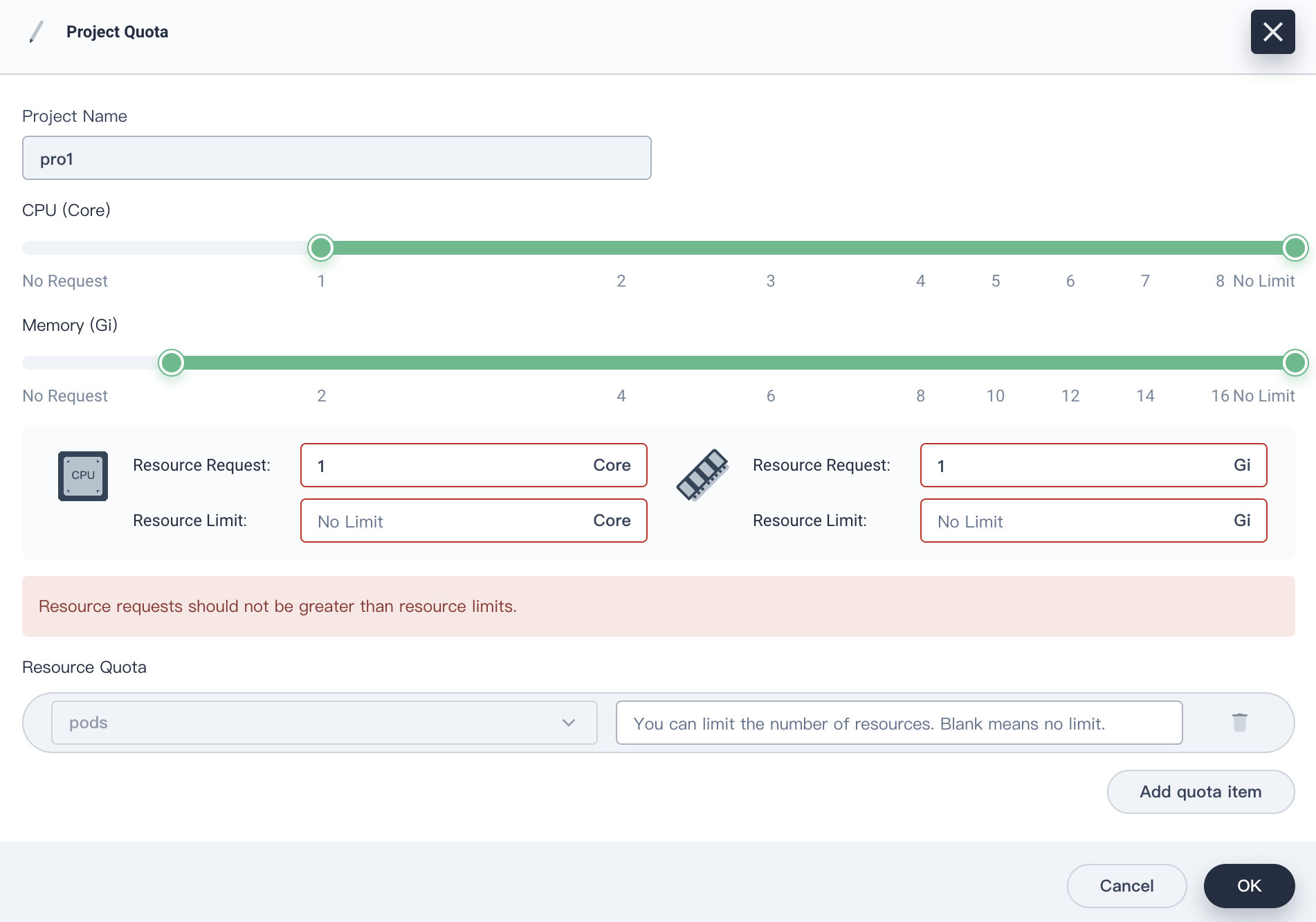 When setting quotas, clear the resource limit input box, and the default value should be ’No Limit‘